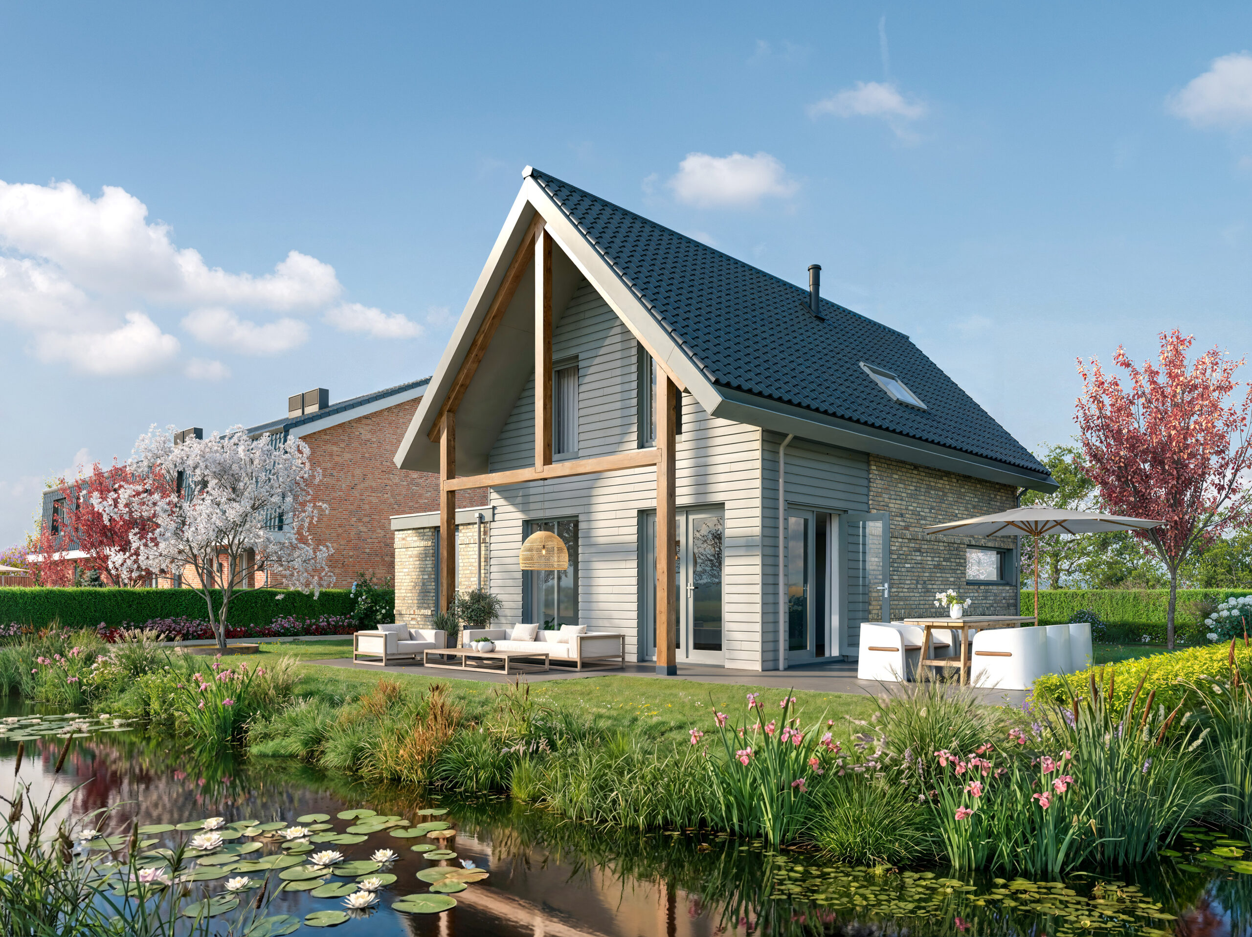 Rust, ruimte en licht staan centraal. Grote raampartijen openen de woning naar het landschap, terwijl de overgang tussen binnen en buiten naadloos aanvoelt. De beelden zijn ontwikkeld om deze woonbeleving direct voelbaar te maken.