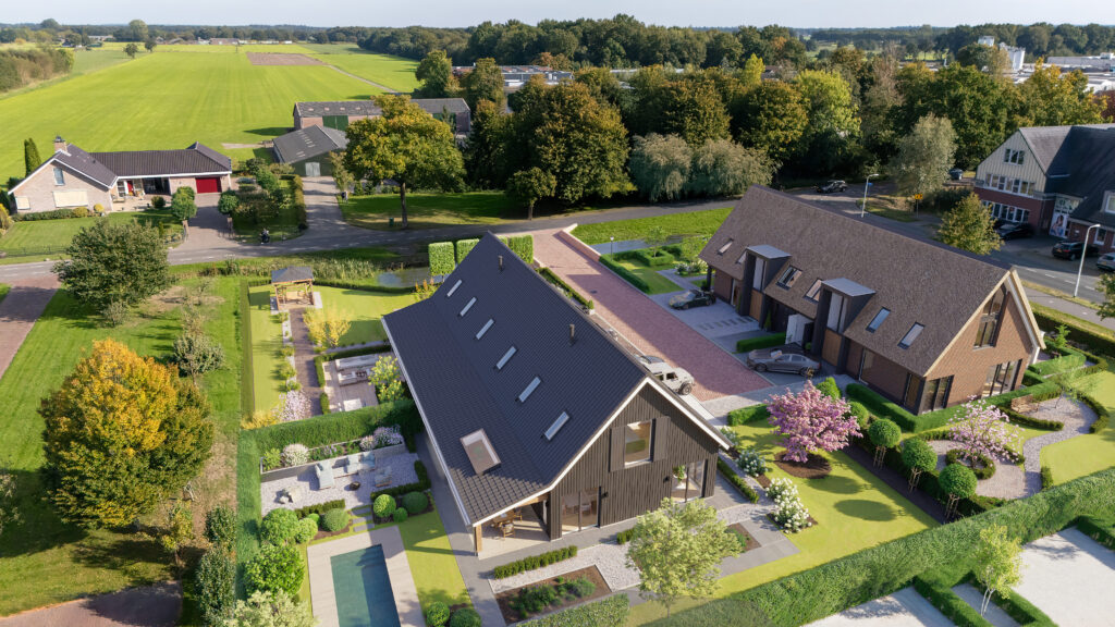Voor de vogelvluchtimpressies hebben we het ensemble zorgvuldig in zijn groene, dorpse context geplaatst. De landschappelijke inpassing speelt een belangrijke rol in de beleving van het plan en versterkt het gevoel van ruimte, rust en exclusiviteit.
